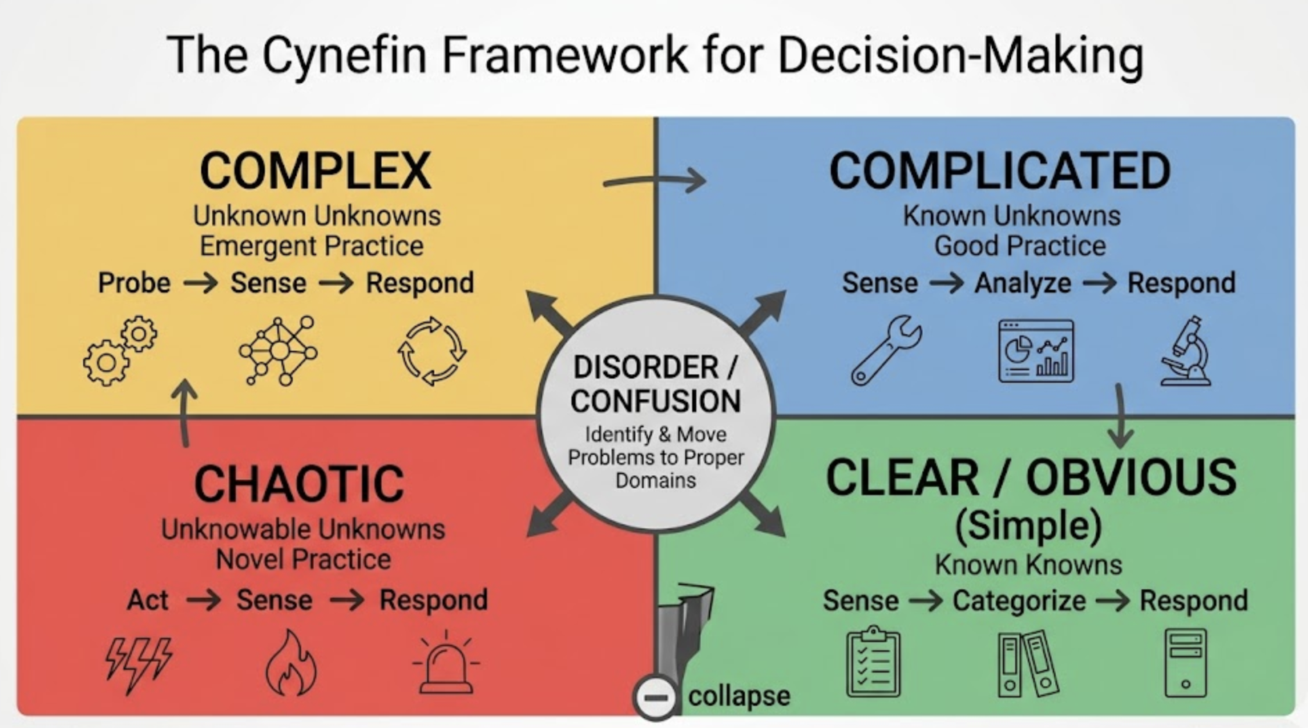 The center of the model is confusion - the danger zone where you don't even know what kind of problem you're dealing with. This is usually where managers try to fix deeply complex human issues with rigid, bullet-point policies.